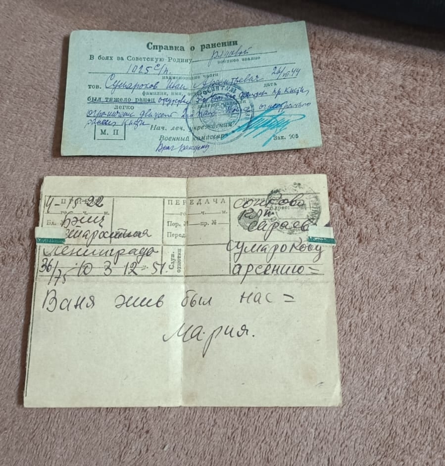 Владимир бережно держит в руках пожелтевшую телеграмму из Ленинграда, датированную мартом 1944 года: Сумарокову Арсению д.Сараево "Ваня жив был у нас" Мария. И поясняет, что два года от отца не было известий. Бабушка с дедушкой очень переживали. При первой возможности, как только с партизанским отрядом вошли в Ленинград, он побывал у родственницы и попросил сообщить родителям, что жив. Все документы, награды хранила бабушка, мама, а после смерти отца я забрал их в свою семью и они будут передаваться следующим нашим поколениям. Я поблагодарила супругов Сумароковых, за то, что они поделились историей жизни Ивана Арсеньевича, который внёс свою долю в Великую Победу.